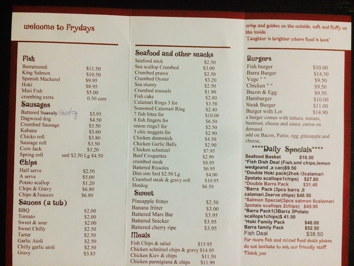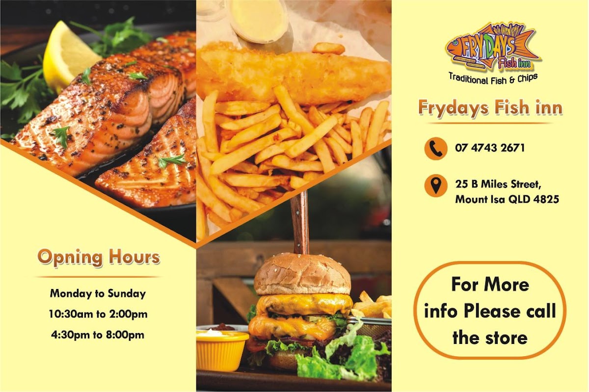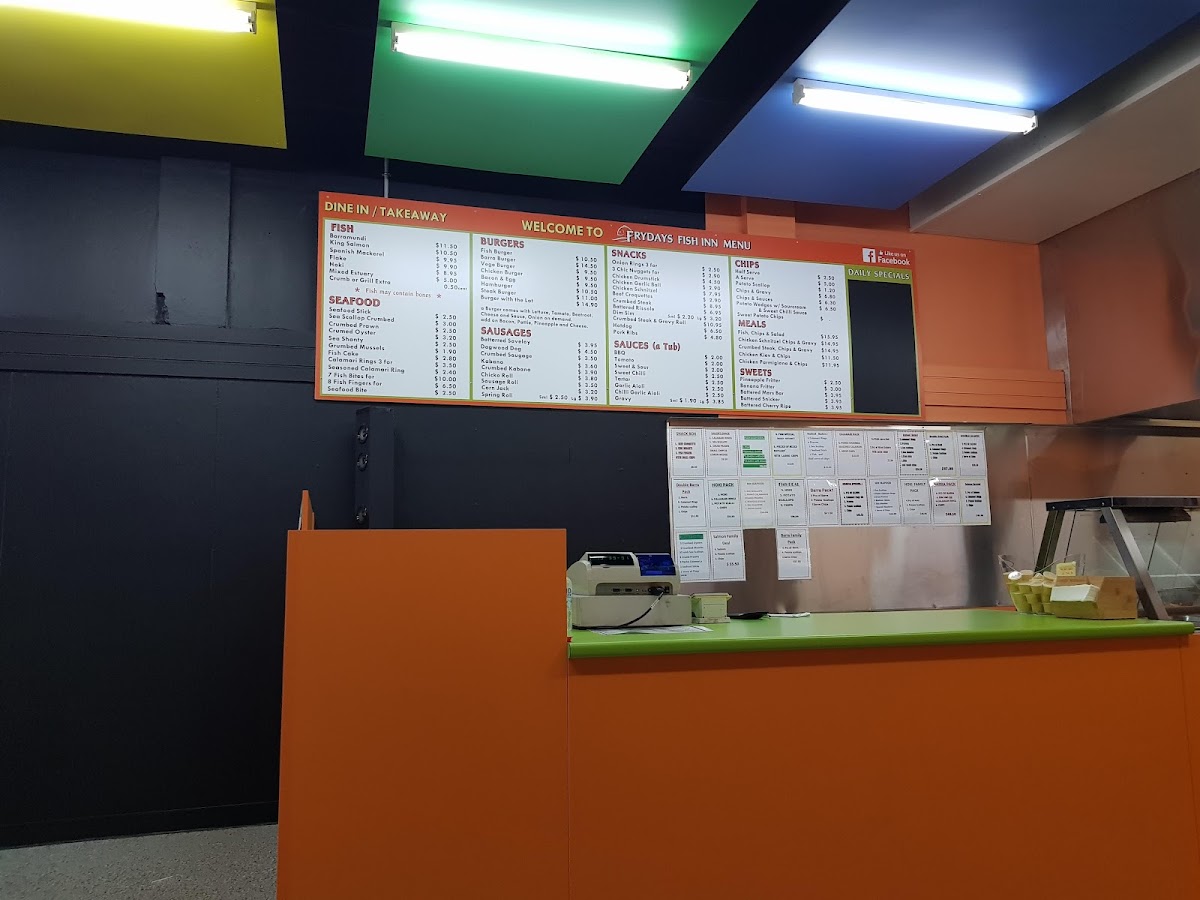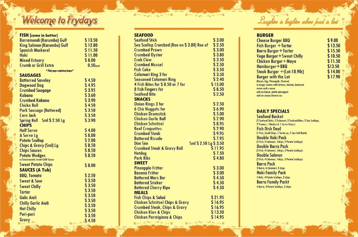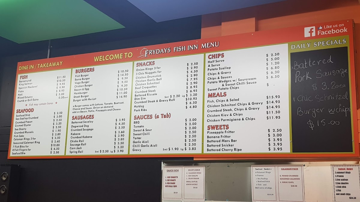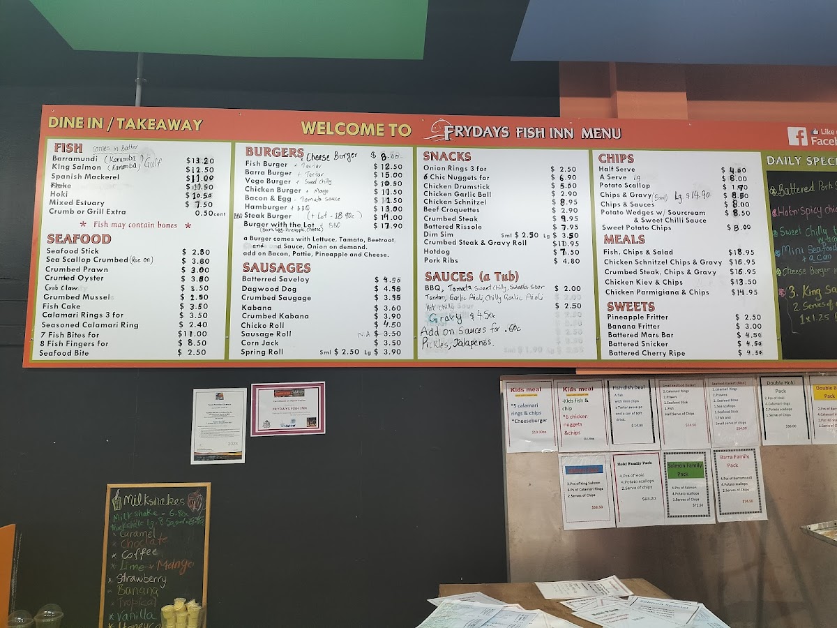 From a reviewer’s perspective, the menu at Frydays Fish Inn offers a generous and approachable selection that caters to both seafood enthusiasts and casual diners. Seafood lovers will find tempting options like Spanish Mackerel and Mixed Estuary, alongside indulgent treats such as Seafood Stick, Sea Scallop Crumbed, Crumbed Prawn, Crumbed Oyster, and Crab Claw, while the daily specials, including the Seafood Basket, Double Barra Pack, Double SalmonBarra Pack, and Hoki Family Pack, provide value for larger appetites. For burger fans, the menu includes Cheese Burger Bbq, Fish Burger +Tartar, Vege Burger+Sweet Chilly, Chicken Burger+Mayo, and Hamburger+Bbq, offering a mix of classic and lighter options. Those seeking smaller bites or snackable treats can choose from Onion Rings 3 For, 6 Chic Nuggets For, Chicken Drumstick, Chicken Garlic Ball, and Chicken Schnitzel, complemented by hearty sides like Chips (Half Serve or Large), Potato Scallop, Chips & Gravy, and a selection of sauces including Bbq, Tomato, Sweet & Sour, Sweet Chilly, Tartar, and Garlic Aioli. The menu also features satisfying meals like Fish Chips & Salad, Chicken Schnitzel Chips & Gravy, Crumbed Steak, Chips & Gravy, Chicken Kiev & Chips, and Chicken Parmigiana & Chips, offering familiar favorites with generous portions. For those with a sweet tooth, the dessert options, such as Pineapple Fritter, Banana Fritter, Battered Mars Bar, Battered Snicker, and Battered Cherry Ripe, deliver a nostalgic, indulgent finish. Overall, the menu strikes a balance between classic fish-and-chips fare, hearty snacks, and playful sweet treats, making Frydays Fish Inn a reliable spot for both casual meals and family outings.